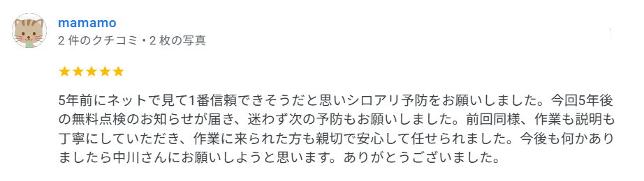 今回5年後の無料点検のお知らせが届き、迷わず次の予防もお願いしました。