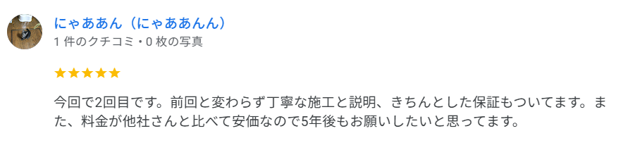 前回と変わらず丁寧な施工と説明、きちんとした保証もついてます。
