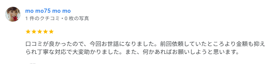 前回の業者さんよりも安く丁寧だったとのことで、今後も継続してより良いサービスをお届けできるよう社員一同で取り組んで参ります。