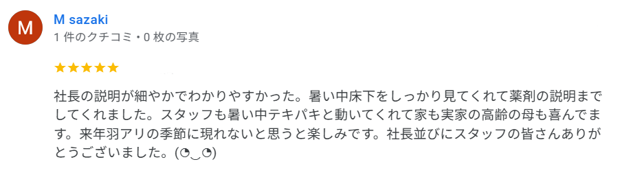 暑い中床下をしっかり見てくれて薬剤の説明までしてくれました。